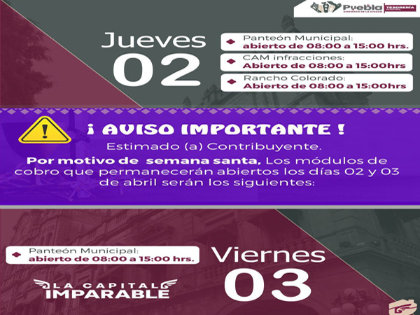 Puebla, Pue.- Con motivo del periodo vacacional de Semana Santa, el Gobierno de la Ciudad, que encabeza el alcalde Pepe Chedraui, informa a las y los contribuyentes los horarios de atención de los módulos de cobro para diversos servicios.