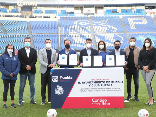 convenio de colaboración entre el Ayuntamiento y el Club Puebla, el objetivo en común es beneficiar a niñas, niños, jóvenes y mujeres de la capital.