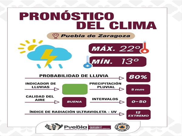 Puebla, Pue. .- El Gobierno de la Ciudad informa a las y los poblanos que se espera un clima nublado con alta probabilidad de lluvia acompañada de tormentas eléctricas durante la tarde-noche. Se prevé una acumulación pluvial aproximada de 0 a 5 mm, principalmente entre las 17:00 y las 19:00 horas. La temperatura máxima será de 22°C y la mínima de 13°C. La calidad del aire se reporta como buena hasta el momento.