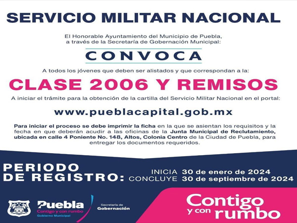 El Ayuntamiento de Puebla, a través de la Secretaría de Gobernación Municipal, invita a los jóvenes Clase 2006 y Remisos, a iniciar su registro para obtener la Cartilla del Servicio Militar Nacional, trámite que continuará abierto hasta el 30 de septiembre de 2024.