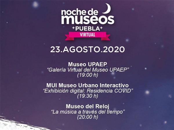 La Noche de Museos iniciará a las 17 horas, los días 22 y 23 de agosto. Cada media hora se subirá un nuevo video en las plataformas de Facebook Noche de Museos Puebla y Puebla Ciudad Patrimonio.