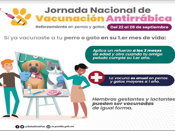 CIUDAD DE PUEBLA, Pue.- Con el objetivo de mantener a Puebla libre de rabia, el gobierno presente de Sergio Salomón, a través de la Secretaría de Salud, anuncia su participación en la Jornada Nacional de Reforzamiento de la Vacunación Antirrábica en Perros y Gatos, a desarrollarse del 22 al 28 de septiembre.