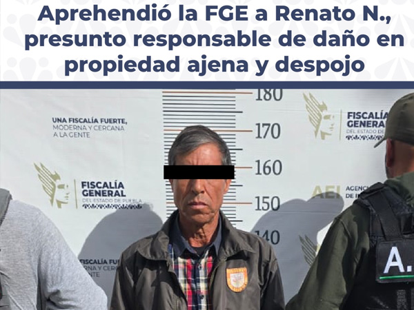 La Fiscalía General del Estado de Puebla informa que se dio cumplimiento a una orden de aprehensión en contra de Renato N., por su probable responsabilidad en los delitos de daño en propiedad ajena y despojo agravado.