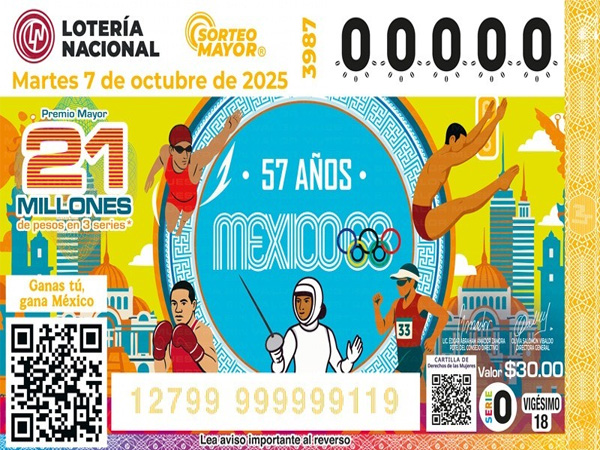 La titular de Lotería Nacional informó que el Sorteo Mayor No. 3987 cuenta con un Premio Mayor de 21 millones de pesos en tres series y una bolsa repartible de 66 millones de pesos. El costo del cachito es de 30 pesos, mientras que el de la serie de 600 pesos.