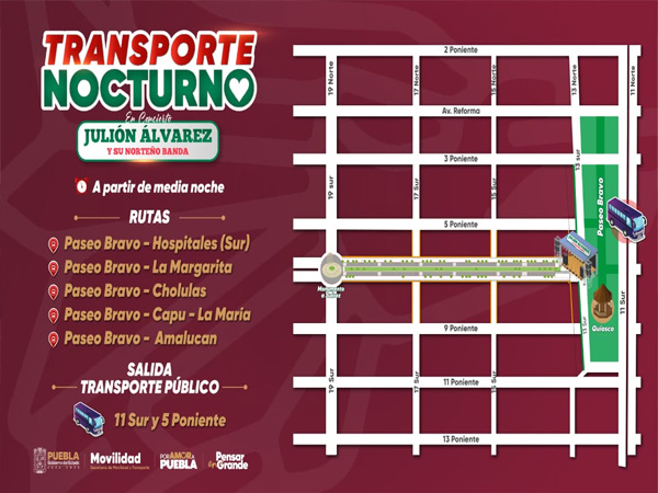 Además, se informa que habrá servicio de transporte público nocturno. Cinco sitios de taxi fueron autorizados, así como cinco recorridos de autobuses que desde la medianoche del concierto del cantante Julión Álvarez saldrán de Paseo Bravo hacia hospitales de la zona sur, La Margarita, Cholula, Capu-La María y Amalucan, para un regreso seguro a casa.