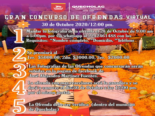 El Honorable Ayuntamiento de Quecholac que encabeza el Presidente Municipal el Lic. José Alejandro Martínez Fuentes te invita al Gran concurso de Ofrendas a través de Facebook.