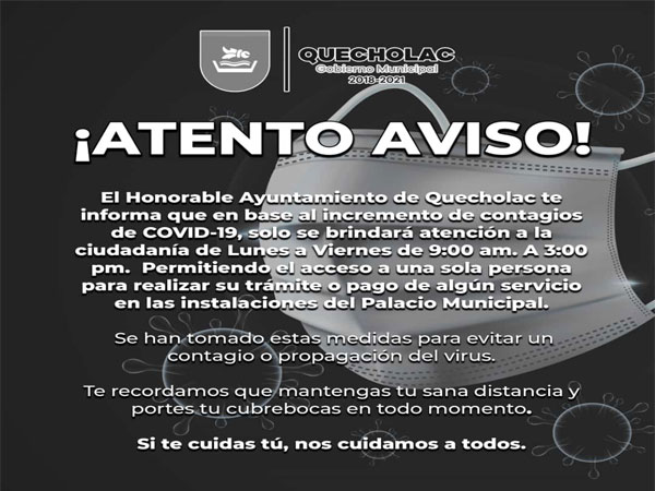 Con la finalidad de salvaguardar la salud de los Quecholences, los horarios de atención serán de Lunes a Viernes de 9:00 am. a 3:00 pm.