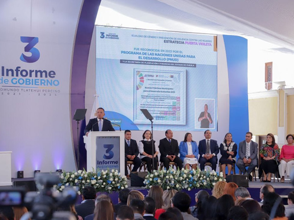 Entre los resultados que Mundo Tlatehui entregó en este Tercer Informe destaca su labor en infraestructura, como la construcción de la segunda etapa del nuevo edificio del Sistema Municipal DIF, el inicio de la Radial a Cacalotepec o la rehabilitación del primer cuadro de Santa María Tonantzintla.