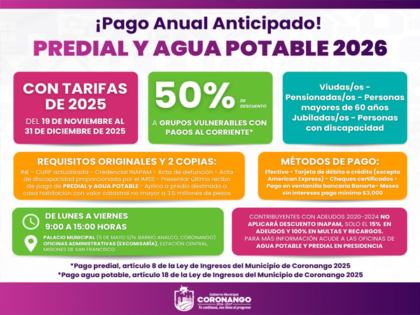 Es importante mencionar que, a partir del 1 de enero, el pago del impuesto predial y del agua potable presentará el incremento considerado en la Ley de Ingresos de Coronango.