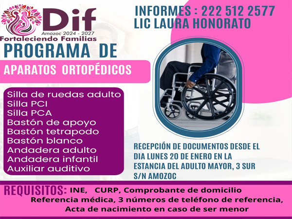 El Sistema DIF Estatal y Municipal de Amozoc a cargo de la presidenta Gloria Barrales Mendoza informa a la ciudadanía que requiera aparatos ortopédicos que ya pueden inscribirse en su programa de apoyo.