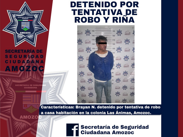 El sujeto de nombre Brayan «N», se encontró con lesiones visibles por lo que se procede a asegurarlo, al mismo tiempo que se le hace del conocimiento sobre sus derechos, para posteriormente ser traslado y presentado ante las autoridades correspondientes por tentativa de robo a casa habitación y riña.