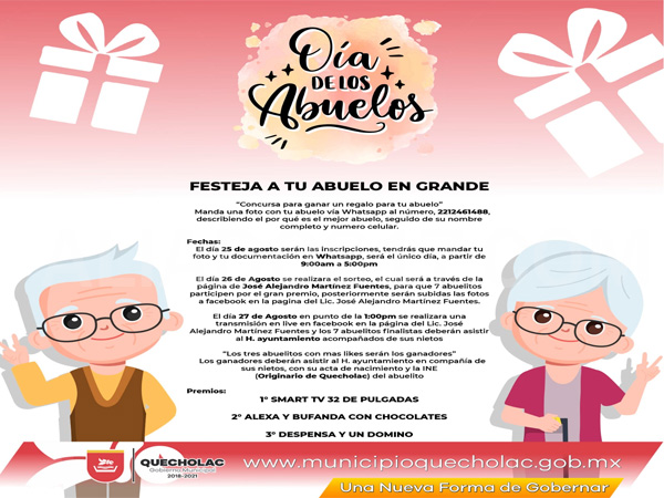 El día 27 de Agosto el H. Ayuntamiento de Quecholac presidido por el Lic. José Alejandro Martínez Fuentes, celebrará el día del Abuelo.