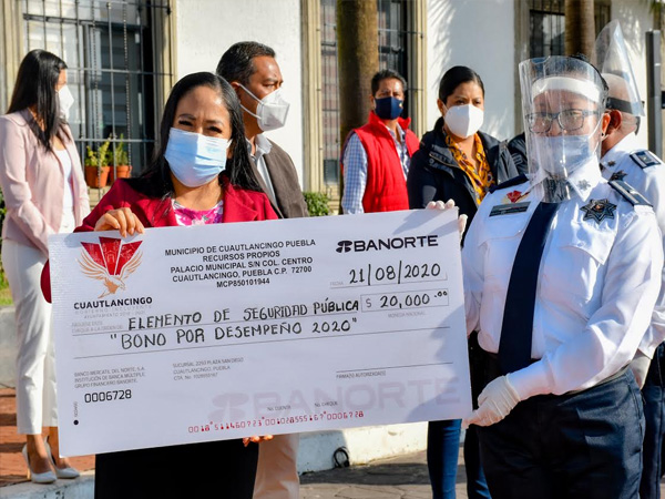 Señaló que con recursos propios por Un millón 520 mil pesos, corresponde la entrega de dicho bono, mientras que la adquisición de 2 patrullas corresponde a FORTAMUN 2020 con una inversión de Un Millón 730 mil pesos y la adquisición de una unidad con una inversión de 730 mil 390 mil pesos provenientes de FORTASEG 2020.