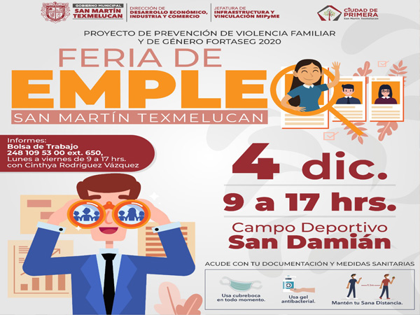 El Gobierno municipal de San Martín Texmelucan a través de la Dirección de Desarrollo Económico, Industria y Comercio, realizará la segunda Feria de Empleo 2020, en la que se ofertarán alrededor de 150 vacantes.