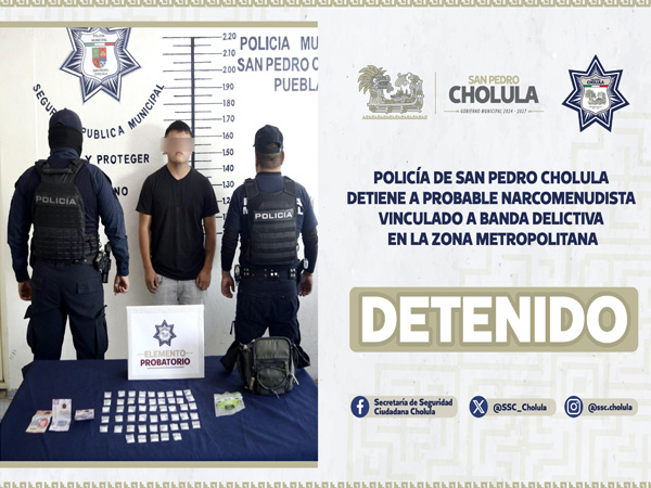 San Pedro Cholula, Pue. – Como resultado de las labores de inteligencia y vigilancia estratégica que implementa la Secretaría de Seguridad Ciudadana de San Pedro Cholula (SSC Cholula) a través del Operativo Junta Auxiliar Segura, se logró la detención de Alan “N”, de 20 años de edad, señalado como probable integrante de una banda dedicada a actividades ilícitas como narcomenudeo, delitos contra la salud, robo a negocios y robo de vehículos.