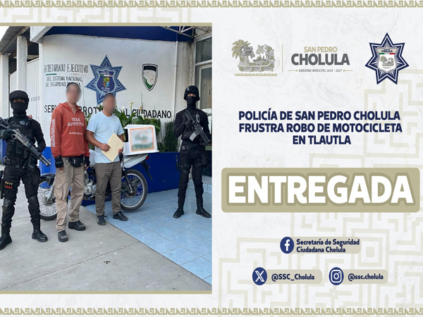 San Pedro Cholula, Pue.- Como resultado de una intervención inmediata, elementos de la Secretaría de Seguridad Ciudadana de San Pedro Cholula (SSC Cholula), frustraron el robo de una motocicleta, en la Junta Auxiliar de San Juan Tlauta.