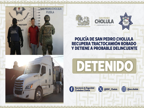 San Pedro Cholula, Pue.- Como resultado de una respuesta inmediata, elementos de la Secretaría de Seguridad Ciudadana de San Pedro Cholula (SSC Cholula) detuvieron a Antonio de Jesús “N” de 40 años de edad, por su probable participación en el robo de un tractocamión.
