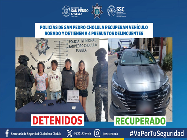 San Pedro Cholula, Pue.- Derivado de una pronta respuesta, elementos de la Secretaría de Seguridad Ciudadana de San Pedro Cholula (SSC Cholula), detuvieron a Samuel “N” de 25 años, Oscar “N” de 27 años, Yadira “N” de 27 años y María Guadalupe “N” de 28 años de edad, por su presunta participación en diversos delitos como portación ilegal de arma de fuego, delitos contra la salud y detentación de vehículo con reporte de robo.