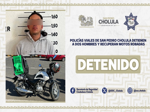 San Pedro Cholula, Pue.- Elementos de la Secretaría de Seguridad Ciudadana de San Pedro Cholula (SSC Cholula) frustraron el robo de una motocicleta en el Barrio de Santa María Xixitla, donde detuvieron a Luis Alfredo “N” de 25 años de edad, por el presunto delito de robo de vehículo.