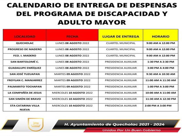 El Honorable Ayuntamiento de Quecholac que encabeza el Presidente sustituto el C. José Luis Peregrina Flores te informa sobre el calendario de entrega de Despensas.