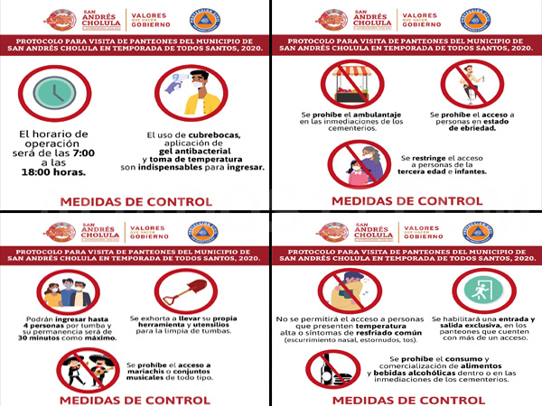 El H. Ayuntamiento de San Andrés Cholula, a través de la Dirección de Protección Civil y Bomberos, da a conocer el protocolo de ingreso y permanencia en los panteones del municipio durante la temporada de Fieles Difuntos, ello para preservar la salud de la ciudadanía, ante la contingencia sanitaria por el COVID-19.