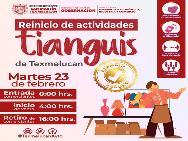 Desde el inicio de la pandemia, el Gobierno Municipal de San Martín Texmelucan ha actuado con responsabilidad para cuidar la salud de las y los texmeluquenses, dando cumplimiento a los Decretos del Estado e implementando operativos en todo el municipio, pero también se ha preocupado por la seguridad económica de todas y todos, razón por la cual se ha emitido un “Acuerdo de Reinicio de Actividades del Tianguis de San Martín Texmelucan”, cuya vigencia inicia este 23 de febrero.