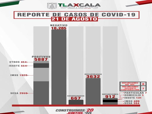 De acuerdo con el reporte del 21 de agosto, la Secretaría de Salud del Estado (SESA) confirmó 23 personas recuperadas, ocho fallecimientos, 36 casos positivos de Covid-19 de tlaxcaltecas identificados en el estado y cuatro en otras entidades.