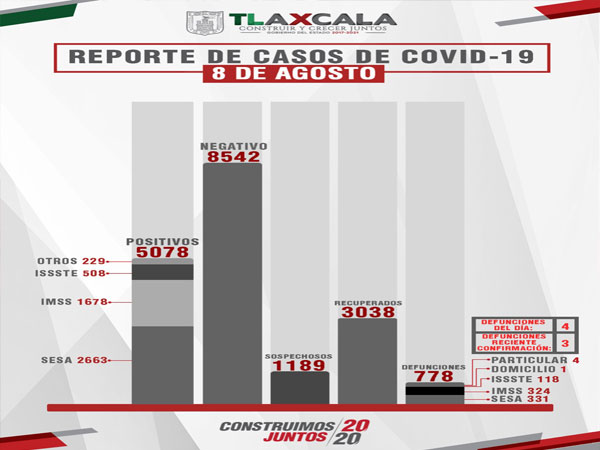 De esta manera, el estado registra tres mil 38 personas recuperadas, cinco mil 78 casos positivos y 778 fallecimientos.