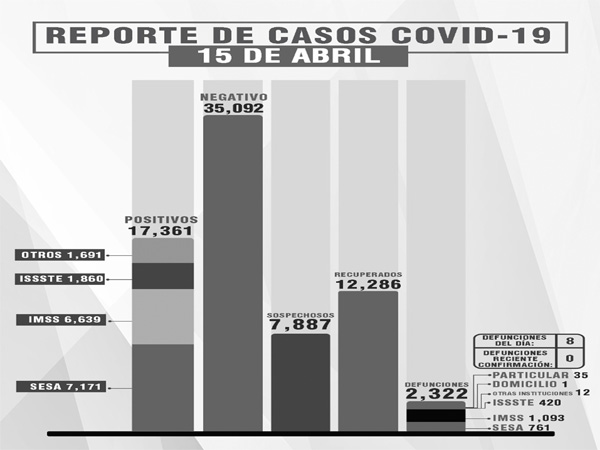 Mientras, del total de fallecimientos, 761 se han registrado en la SESA, mil 93 en el IMSS, 420 en el Issste, 12 en otras instituciones, uno en domicilio particular y 35 en hospital privado.