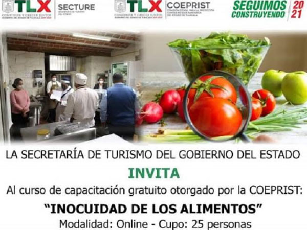 La Comisión Estatal para la Protección contra Riesgos Sanitarios de Tlaxcala (Coeprist) y la Secretaría de Turismo del Estado (Secture) invitan a prestadores de servicios y dueños de establecimientos del sector a la capacitación en línea gratuita sobre «Inocuidad en los Alimentos».