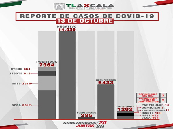 Como parte de la información que presentó la dependencia, se informó que, de acuerdo con el reporte del 13 de octubre, se confirmaron 17 personas recuperadas, 31 casos positivos de Covid-19 de tlaxcaltecas identificados en el estado, además de tres fallecimientos, de los cuales uno se registró en la SESA y dos en el IMSS, así como dos defunciones de reciente confirmación que se registraron una en la SESA y otra en el Issste.
