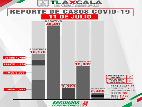 De acuerdo con el reporte del 11 de julio, la Secretaría de Salud del Estado (SESA) dio a conocer que no se reportaron defunciones por Covid-19 en la entidad, y confirmó nueve personas recuperadas y 13 casos positivos de tlaxcaltecas identificados en el estado y cuatro en otras entidades.