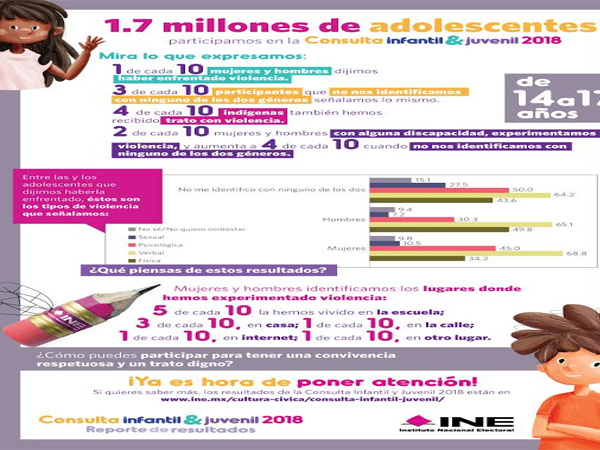 Lo anterior forma parte de los resultados plasmados en la Consulta Infantil y Juvenil 2018 y en las mesas de trabajo para analizar las respuestas dadas por 272,114 niñas, niños y adolescentes, número que representa 17.9% de la población que tiene entre 6 y 17 años en el estado de Puebla y que participaron en la consulta.