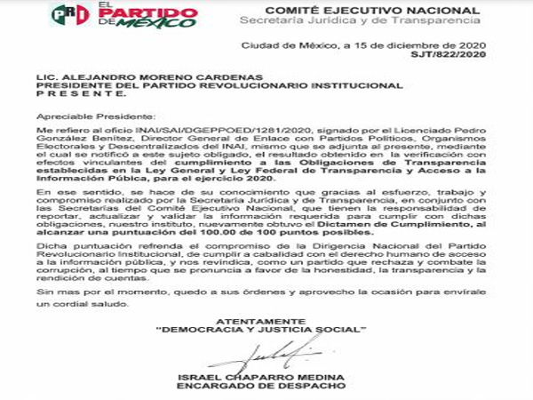 El Instituto Nacional de Transparencia, Acceso a la Información y Protección de Datos Personales (INAI) dictaminó las Obligaciones de Transparencia, establecidas en la Ley General y Ley Federal de Transparencia y Acceso a la Información Púbica, realizadas por el Partido Revolucionario Institucional (PRI), otorgándole una puntuación de 100 de 100 puntos posibles.