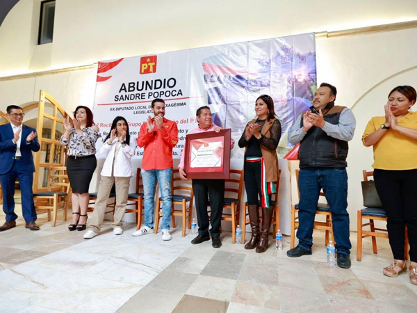 El legislador Toño López en su calidad de coordinador de la bancada del Partido del Trabajo (PT) en el Congreso de Puebla, encabezó la entrega de un reconocimiento a Abundio Sandre Popoca por sus acciones en favor de la cultura y las tradiciones en el municipio de San Pedro Cholula.