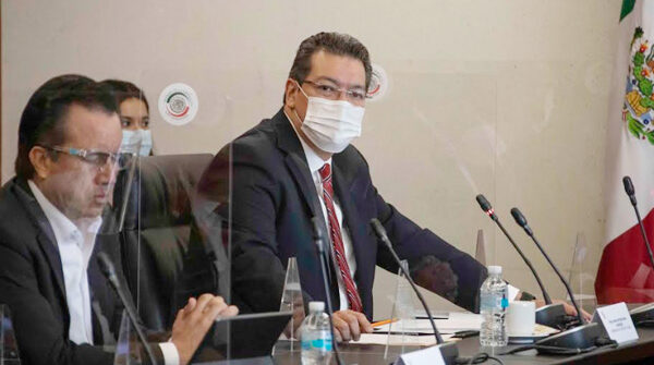 El gobernador Alejandro Armenta, acompañado por el presidente de la Junta de Coordinación Política de la Cámara de Diputados,…