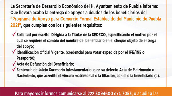 La Secretaría de Desarrollo Económico del Ayuntamiento de Puebla (Sedeco) informa que se llevará a cabo la entrega de…