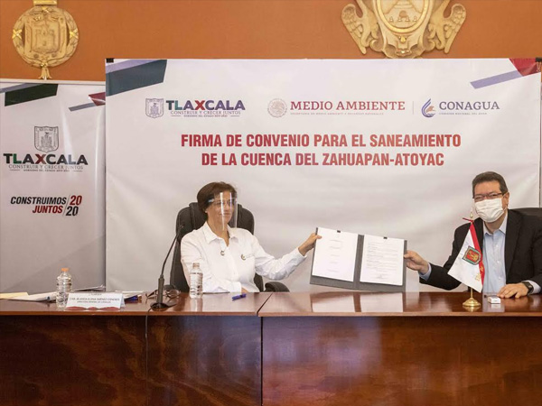 El Gobernador Marco Mena y la Directora General de la Comisión Nacional del Agua (Conagua), Blanca Jiménez Cisneros, firmaron el convenio de coordinación interinstitucional para integrar el Programa de Saneamiento del río Zahuapan-Atoyac y sus afluentes.