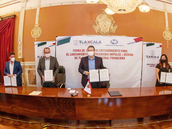 El Gobernador Marco Mena y Nacional Financiera firmaron la Carta Intención del Programa Impulso Económico y Fomento al Empleo en Tlaxcala, que tendrá una bolsa total de 115 millones de pesos para entregar financiamientos de hasta 5 millones de pesos a Micro, Pequeñas y Medianas Empresas (Mipymes) locales, durante la pandemia por Covid-19.