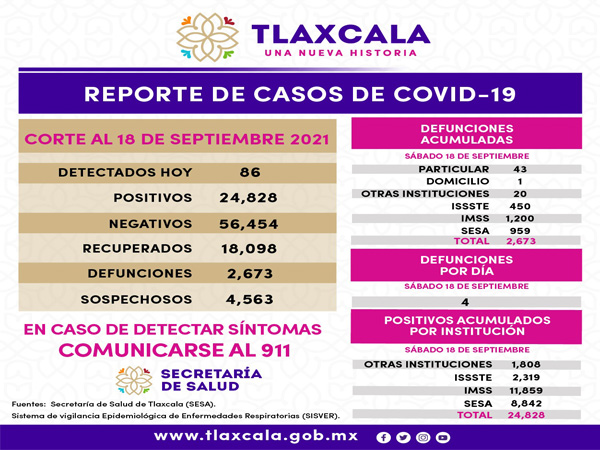 y cuatro defunciones el sábado 18 de septiembre de 2021.