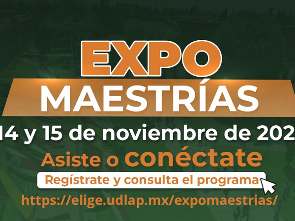 Cholula, Puebla; a 7 de noviembre de 2023.- Este 14 y 15 de noviembre la Universidad de las Américas Puebla (UDLAP) te invita a ser parte de la Expo Maestrías 2023, evento en el que de manera presencial o vía Internet, conocerán toda la oferta académica de nivel maestría que te brinda la UDLAP, la cual comprende 15 maestrías distribuidas en sus 5 escuelas: Artes y Humanidades, Ciencias Sociales, Ciencias, Ingeniería, y Escuela de Negocios y Economía.