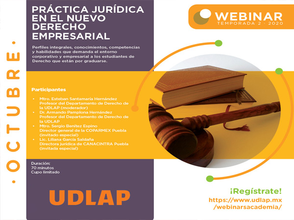 Representantes de la Universidad de las Américas Puebla (UDLAP), la Confederación Patronal de la República Mexicana Puebla (COPARMEX), y la Cámara Nacional de la Industria de la Transformación Puebla (CANACINTRA), se unieron para analizar “La práctica jurídica en el nuevo derecho empresarial”, evento que se realizó como parte de la segunda temporada de los Webinars con la Academia UDLAP.