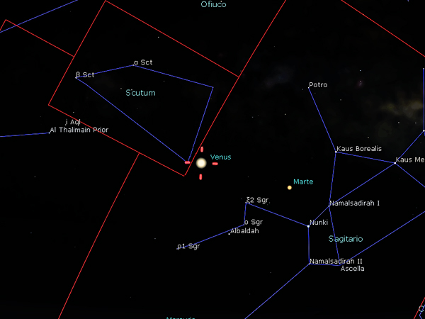 Durante la madrugada del 13 de febrero, tendremos una estupenda imagen planetaria digna de un concurso. Los planetas Venus y Marte estarán en conjunción, es decir, ambos planetas estarán compartiendo una de sus coordenadas ecuatoriales, la llamada ascensión recta. En ese momento, el planeta más brillante en el cielo, Venus, estará 6° 34´ al norte del planeta rojo. Para completar el cuadro, tendremos al planeta Mercurio un poco más al este, muy cerca de alcanzar su máxima altura en su aparición matutina. Los tres cuerpos celestes se localizarán en dirección de la constelación de Sagitario.