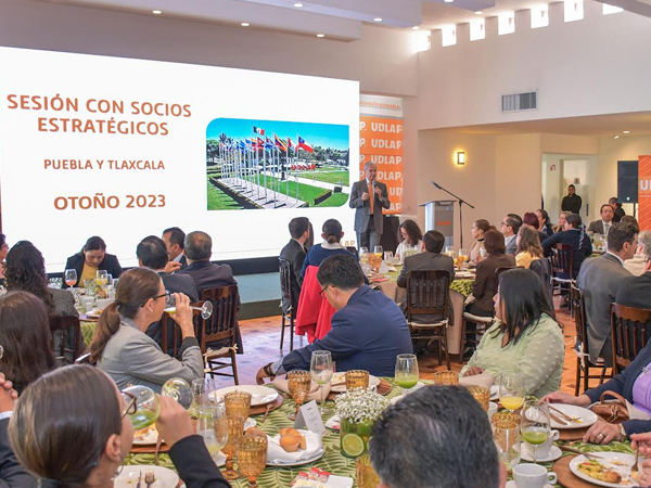 Durante la sesión con socios estratégicos de Puebla y Tlaxcala, el rector de la UDLAP, dio a conocer cómo se encuentra la universidad en estos momentos, cuáles han sido sus logros y los principales elementos que distinguen a la institución, tales como los resultados del estudio de Universum, organismo líder global que colabora con universidades públicas y privadas más importantes del mundo en la evaluación del talento universitario, en donde se refleja principalmente el nivel de satisfacción de los estudiantes hacia la universidad, que en este año es de 9 sobre el promedio de 8 que obtuvieron otras universidades de México.